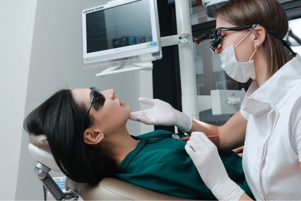 Before the procedure, the patient's eyes are covered with dark glasses to protect them from ultraviolet radiation. The doctor applies an ointment to the oral mucosa to relieve irritation.